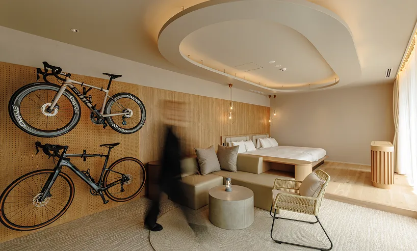 “BICYCLE”」をブランドコンセプトに、自転車を軸に“点と点をつなぐ”体験をサポートする拠点として機能する。プロレーサーが走る競輪場に隣接し、サイクリストのためのバイクメンテナンス、GYMなど多様なサービスを備えることで、旅の前後をシームレスにつなぐ。